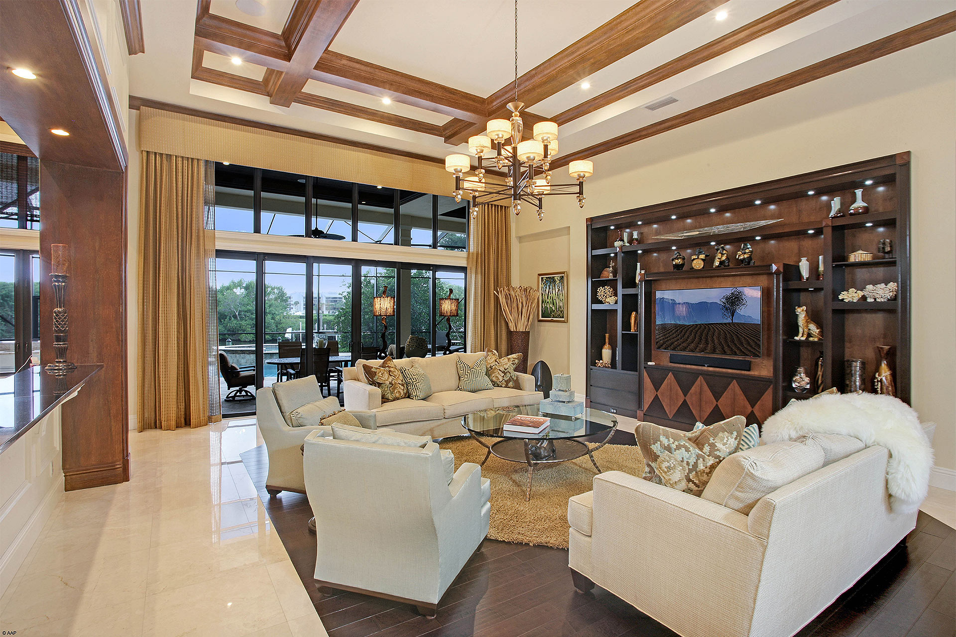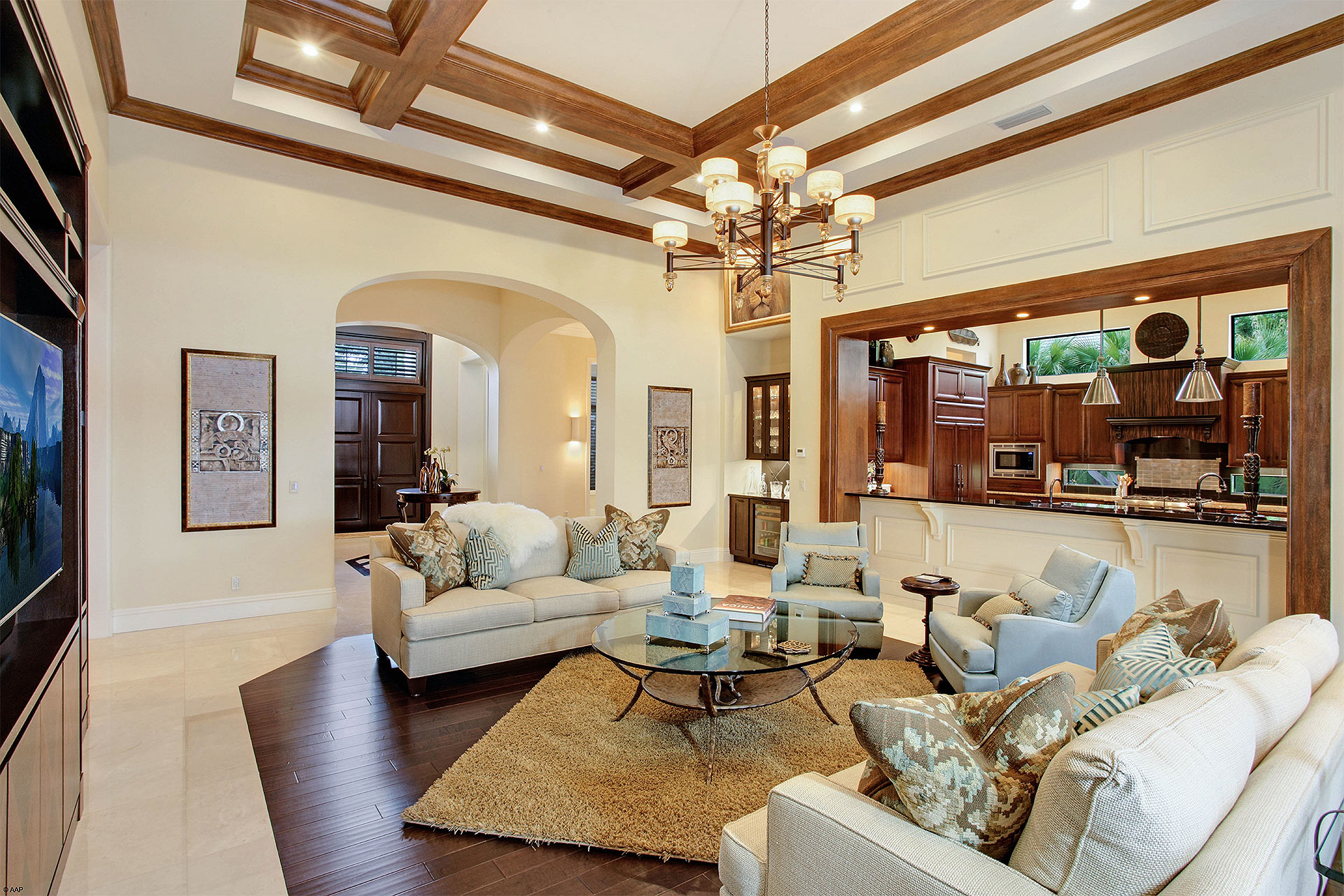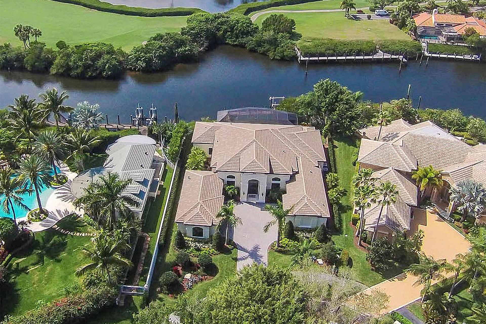 Fantastic use of dark wood throughout this modern Mediterranean creates a warm, tropical sanctuary for waterfront living in Jonathan’s Landing golf course community. Expansive screened in patio and pool area offers splendid outdoor entertaining.